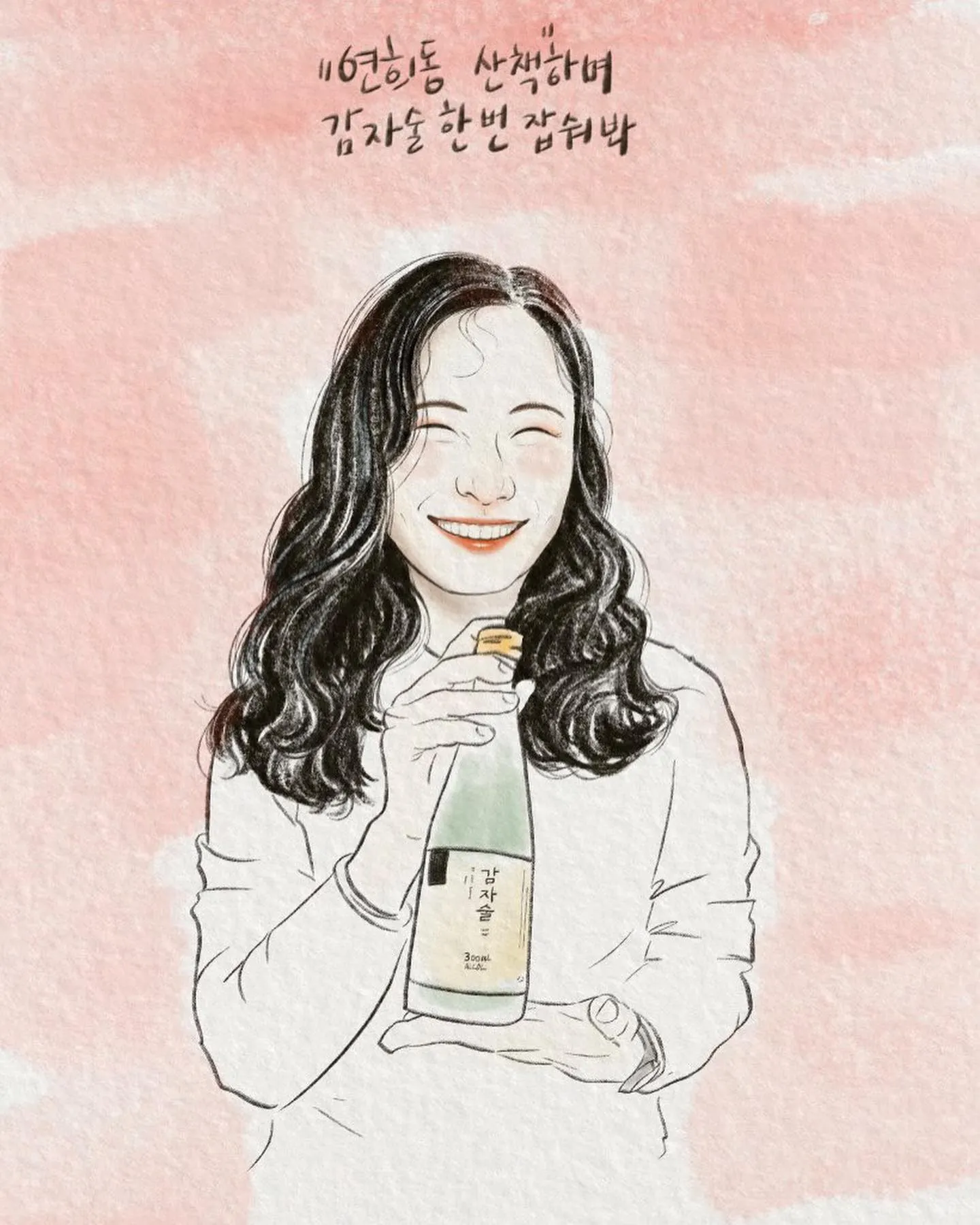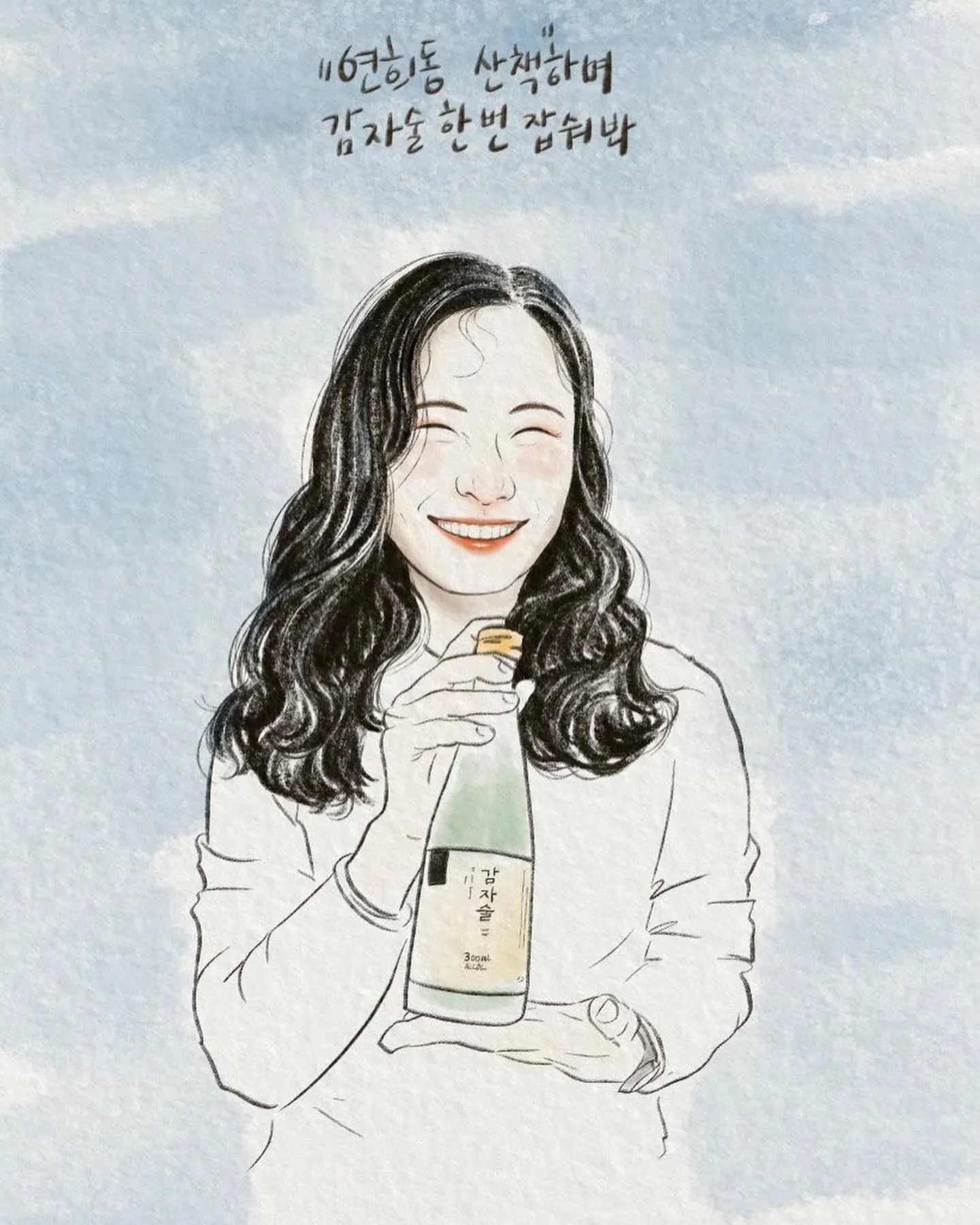 며칠 전 스토리에 올렸던 사진을 그림으로 재해석해 보내주셨다. 감사하고 뭉클하다. 가슴 벅차게 반갑고 기쁘다. 감자술과 웃는 모습이 잘 어울려 전하고 싶으셨다니. 이유도 다정하다.